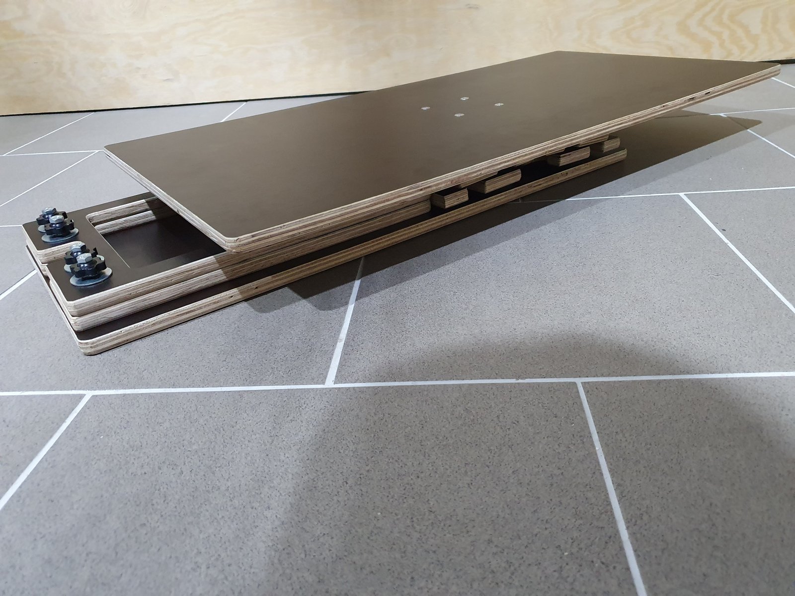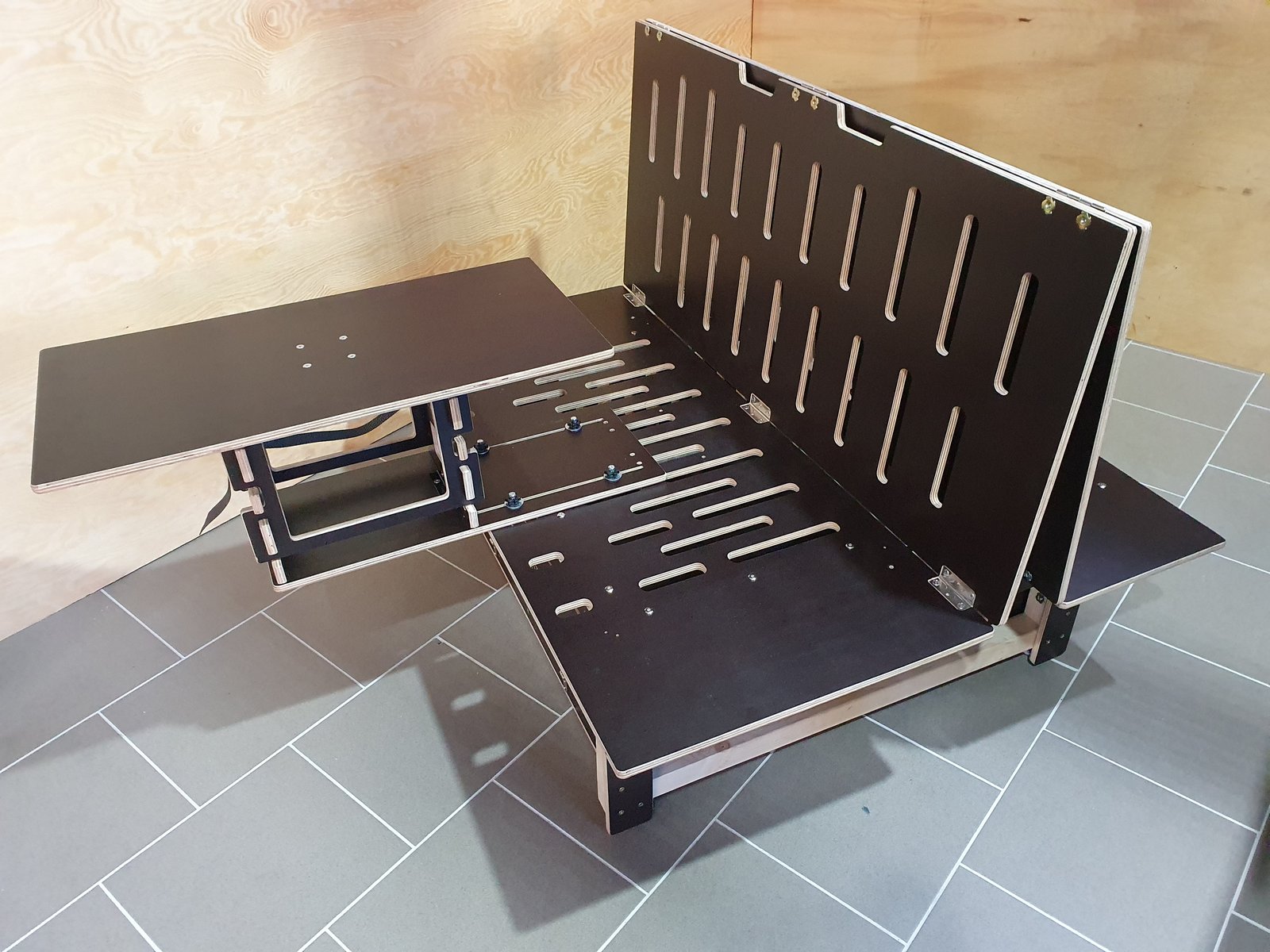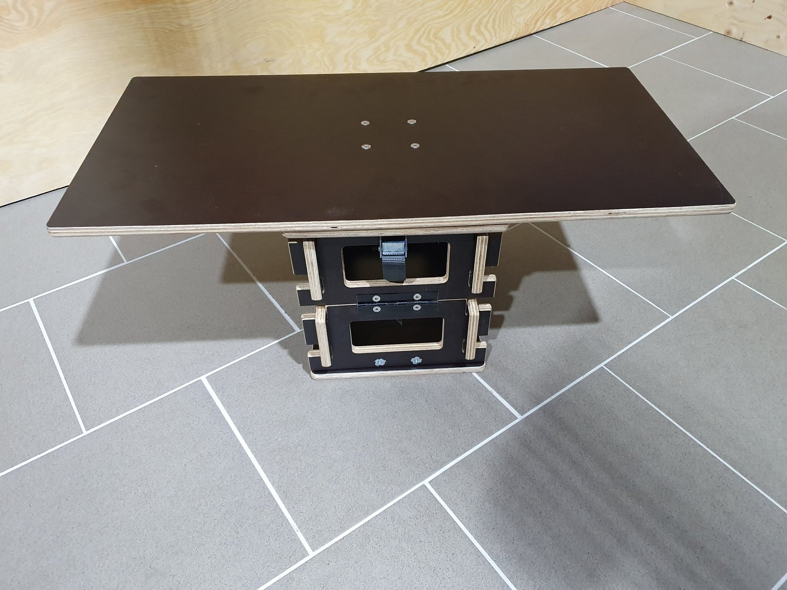 All pieces, including the hinges are being fastened to the plywood elements with M5 screws and pressed in t-nuts. This results in a robust, solid table which is not to be compared with one where the elements/pieces are being held together by wood screws.