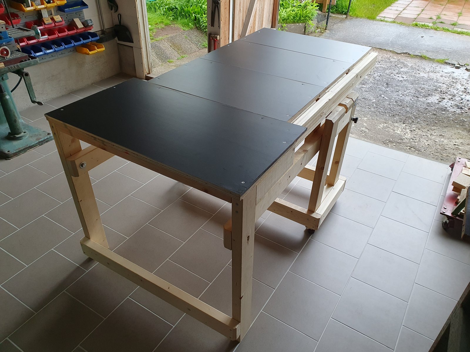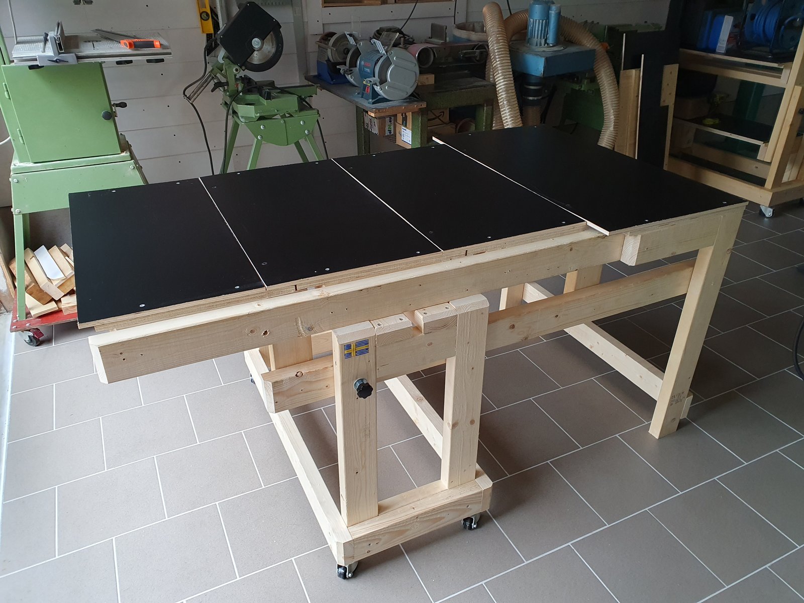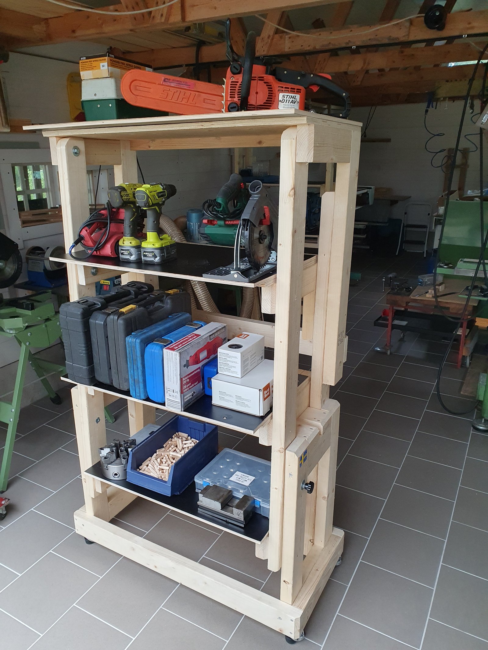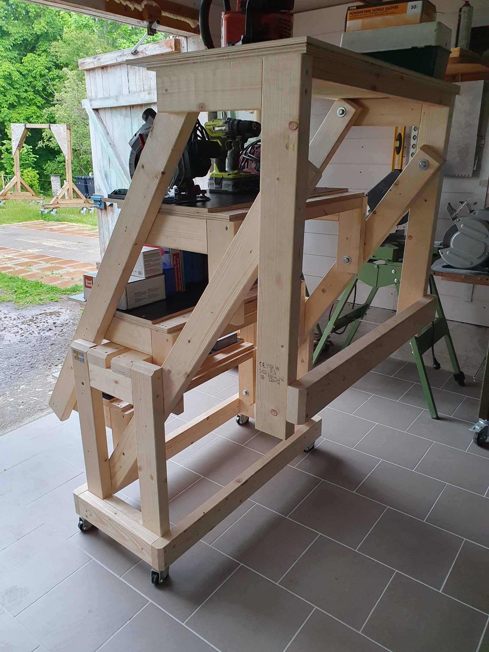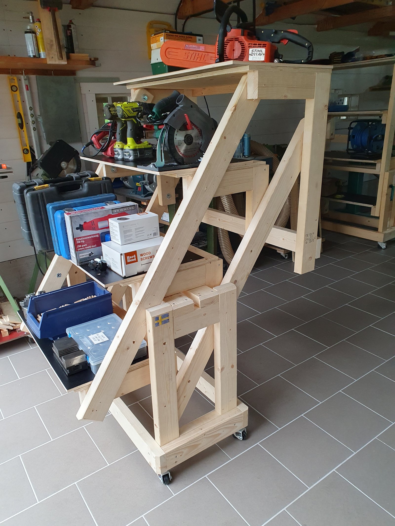 A flexible and robust workbench with wheels for easy movement. Perfect for the workshop or garage. Can be used as a workbench or storage shelf.